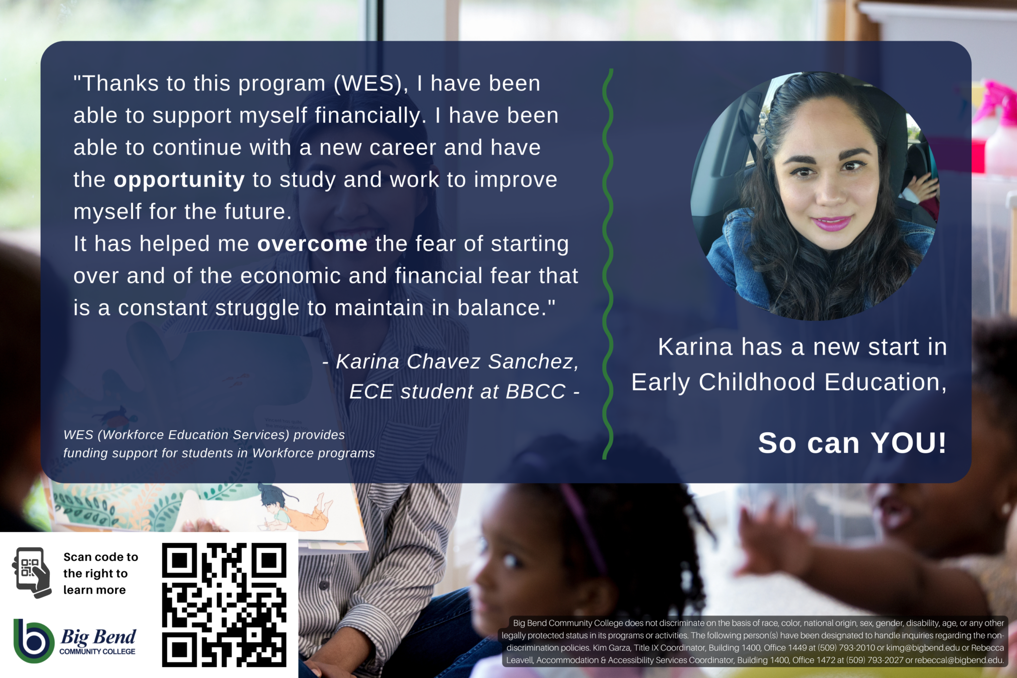 I thought college was only for smart people who received all A’s in high school. However, Big Bend Community College gave me a second chance to redeem myself. I also thought only rich people went to college. I was wrong again. Big Bend helped me with financial aid through the Early Achievers Grant. Throughout all of my classes, I learned how to become a better teacher and person as well. The teachers and advisor were always attentive and ready to help. I used every resource I had: the library, writing center, and the Student Success Center. Even as a first-generation college-student I managed my way around.